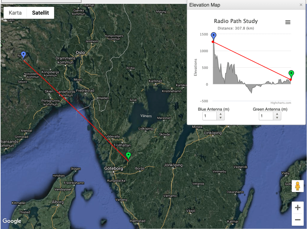 Nu finns det ett bra verktyg för att analysera fri sikt för radio. Med hjälp av google maps och den här websidan kan man lätt experimentera med potentiella räckvidder från olika QTH. Man kan även justera antennens höjd över mark. Dock tycker jag inte att den verkar ta hänsyn till jordens krökning, den hävdar till exempel fri sikt från Irland till Newfoundland. Därför bör man tolka resultaten vid längre distanser med försiktighet.