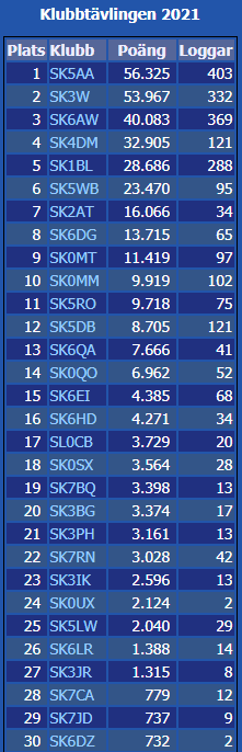 | Under helgen som passerat gick tävlingen CQ WW WPX CW av stapeln på kortvågsbanden. Från klubben deltog Mats, RM2D/SM6LRR samt undertecknad, Johan SE6J/SM6XHM. Under föregående vecka upplevde vi en del besvärligt rymdväder som lyckligtvis lugnade ner sig fram mot fredagen och initialt erbjöd ganska fina konditioner. Lördagen erbjöd en hel del DX på 10M bland annat. Dock genomgående knapert mot USA, upplevde både undertecknad och Mats. Under söndagen drog jag mig ur men Mats fortsatte att jobba mot Nordamerika. Slutresultatet redovisas nedan. Sammanfattningsvis håller vi fortsatt vår 8:e plats i SSA HF Cup! RM2D: 1815 QSO, 1815 poäng till SSA HF Cup SE6J: 402 QSO, 603 poäng till SSA HF Cup Trevlig fortsatt vecka önskas alla medlemmar! Johan SM6XHM |