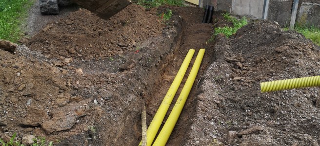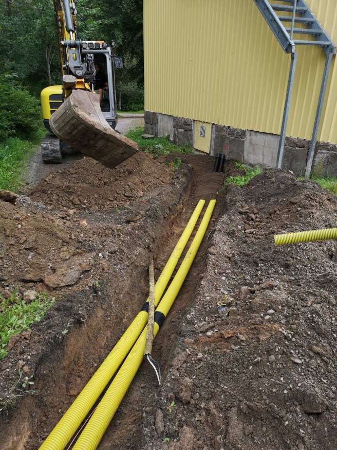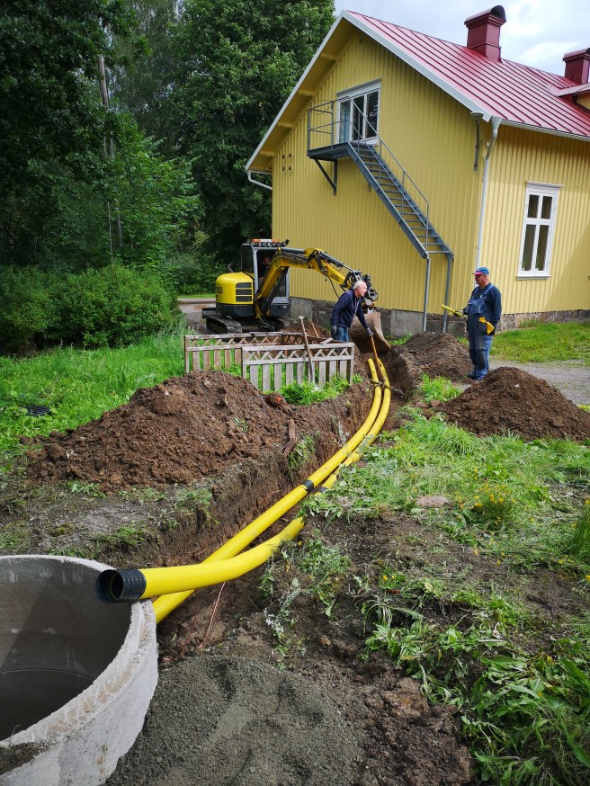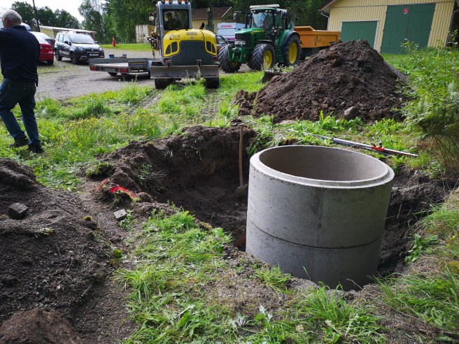 Redan kl 10.00 startade arbetet med att gräva och lägga ner tre cementringar som fundament till masten samt gräva för att kunna lägga ner 2 st rör för koaxialkablage och jordkabel fram till husgaveln. Det var Kent SM6ZDO, Per SM6WNR och Henrik SM6FMO från RKVasa samt Anton som sköter grävmaskinen. Allt gick bra mycket bra och vädret kunde inte bli så mycket bättre med strålande sol.
